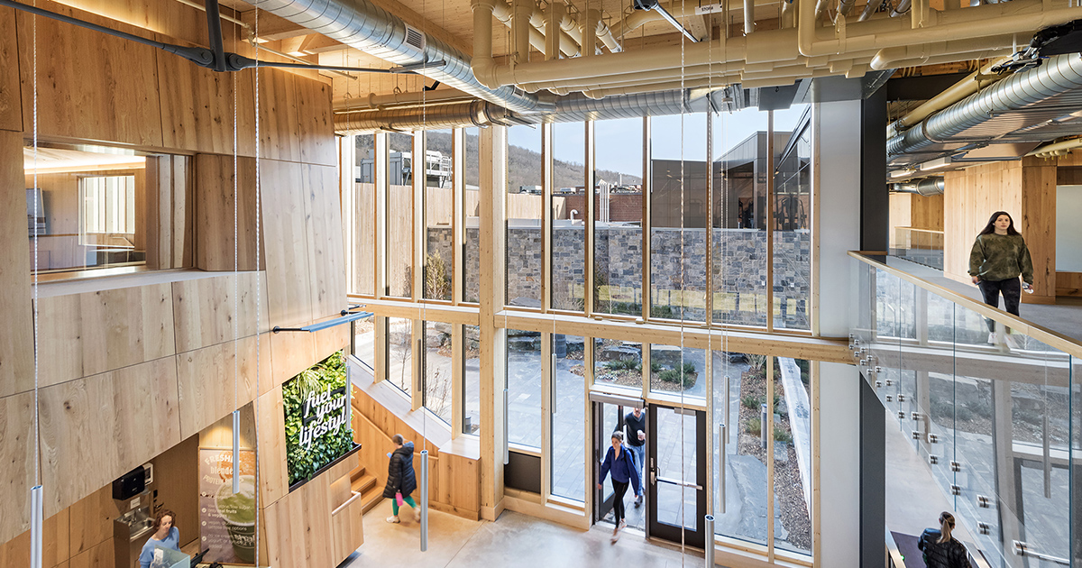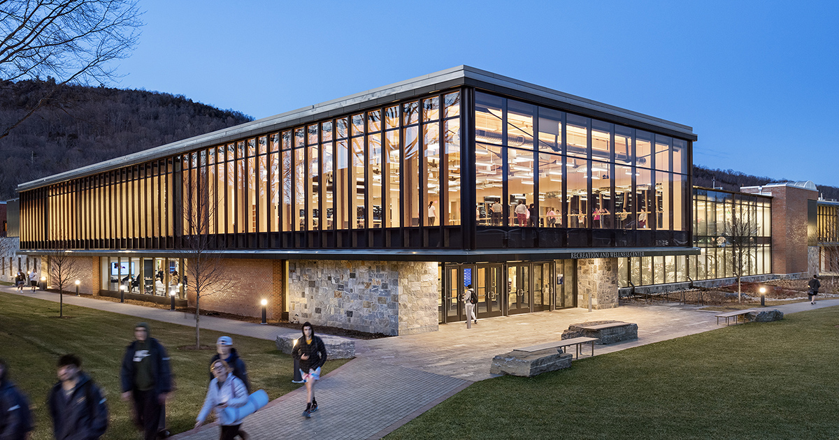 Located adjacent to the mountains of Sleeping Giant State Park, Quinnipiac University is surrounded by natural beauty, and architects designLAB and S3Design, Inc. took full advantage of the natural setting when designing the Recreation and Wellness Center. Described as a “comprehensive wellness ecosystem,” the facility incorporates building materials sourced from the surrounding area; local stone and wood feature prominently in the architecture. Expansive windows help emphasize the connection to nature by providing panoramic views of the nearby mountains, and living walls composed of plants help to bring the outside in even during the cold Connecticut winters.