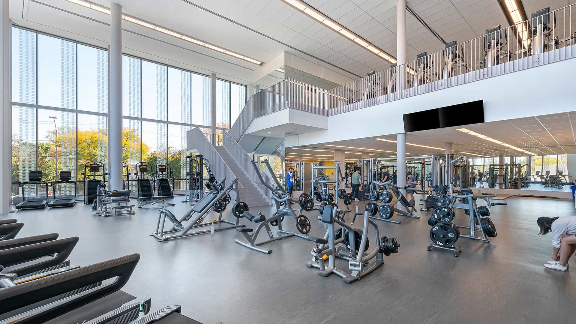 - A two-level fitness center containing free weights, cardio machines, strength equipment, and studios for fitness classes