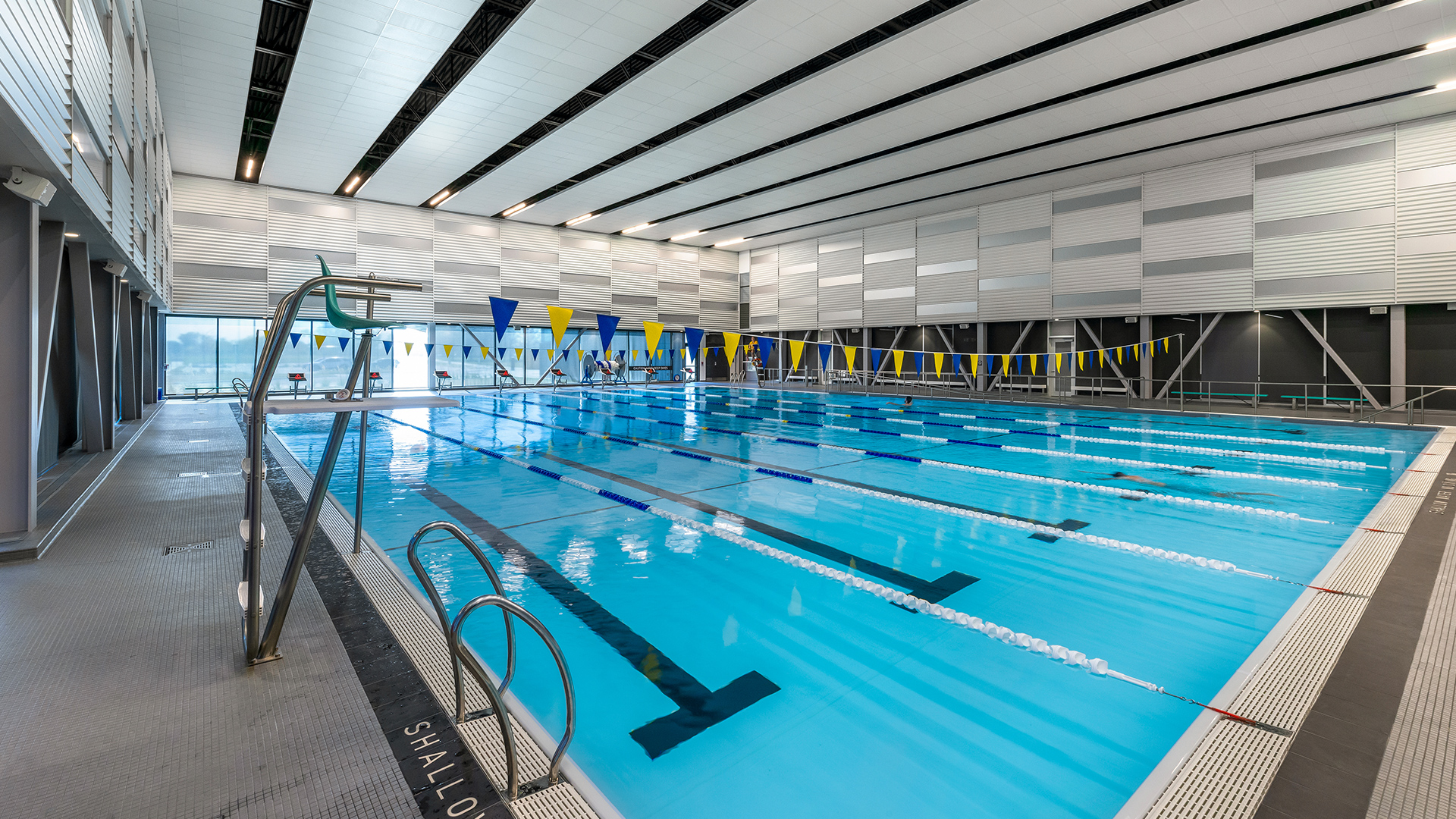 Visitors to the Toldo Lancer Centre will find accessible showers, restrooms, changing rooms, fitness equipment, and hydration stations as well as wheelchair ramps, wave-to-open doors, and a zero-entry ramp to access the pool. Braille signage and the presence of multiple gym scoreboards—as well as the use of large windows and LED lighting throughout the building—provide higher visibility for guests with vision impairments. Acoustic paneling in the pool area helps to dampen sound for guests with sensory sensitivities.