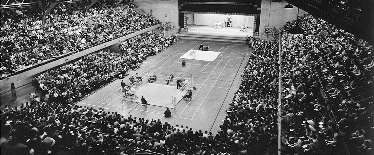 In 1930, the brand-new Gregory Gymnasium opened for the men’s program. Soon after, Berry and the Men’s Intramural Program took ownership of a tract of land just south of Gregory Gymnasium that served as the men’s fields until 1967. With a new gym that also included a natatorium and new fields, the decade of the thirties was one of explosive growth in participation and popularity. One popular event started by Berry in 1932 was Fite Night. This event culminated in the spring championship games in basketball and volleyball, and finals in ping pong, wrestling, and boxing. Fite Night became so popular that tickets had to be issued as crowds exceeded 7,000 people. In 1951, though, boxing was outlawed. A change to Sports Night didn’t carry the same appeal as Fite Night and Sports Nite was eventually cancelled.
